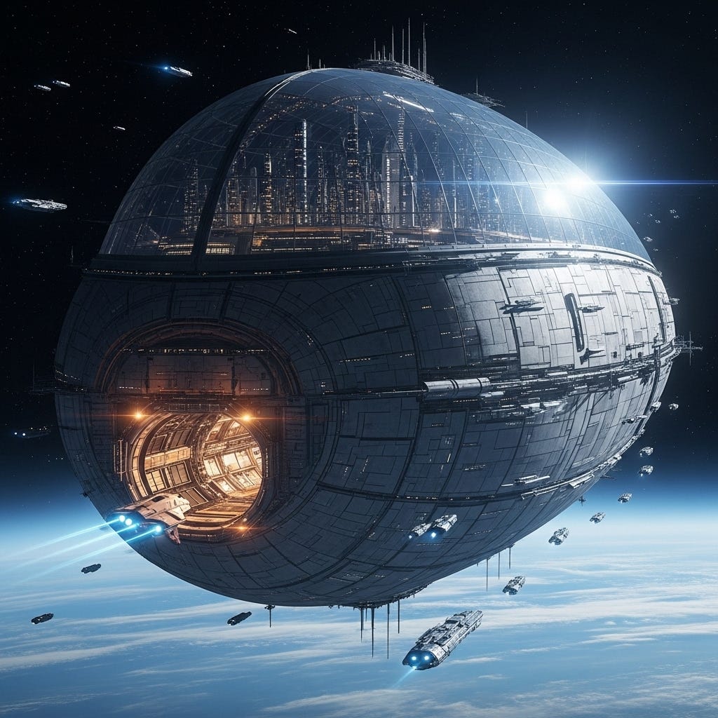 After several more minutes, they were in front of the great opening yawning from below the top level of the station. From their secure bubble of translucent Xarphene, they could see the protective dome glistening in the starlight and the silhouettes of the dome scrapers inside. They were part of the horde of ships moving in to access the port. Ships were flying next to them in every direction, the joint computing power of them all choreographing their movement in precision only machines could achieve. Parallel to their cohort, the same dance took place for ships on their way out.